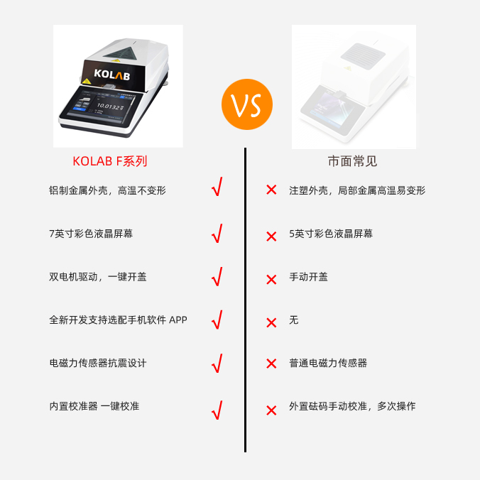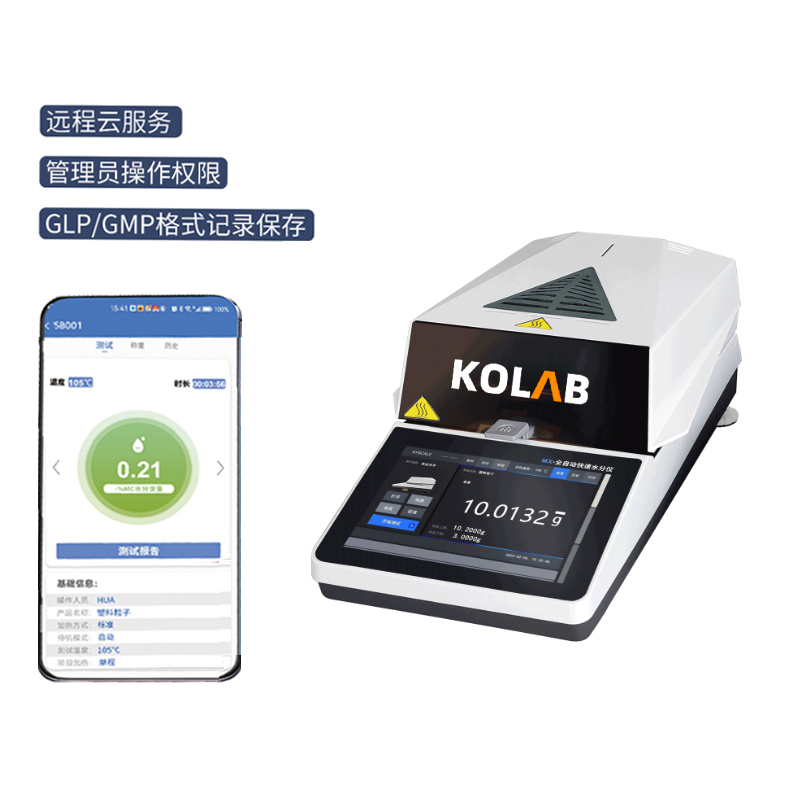 KOLAB品牌KX-F01PRO水分測定儀采用7寸液晶觸摸屏,支持中英文語言切換,內置了多種樣品測試方案可供選擇,儀器軟件樣品名稱、公司、時鐘日期、聯系方式等輸入編輯。儀器支持權限區分,支持管理員、操作員密碼區分權限登錄。系統內存可容納200組設置地址和歷史測試數據查看并可按照GLP/GMP格式記錄保存數據,可外接打印機支持多種規格標簽紙打印。儀器支持WIFI/遠程云服務 手機聯網數據監測(選配),水分儀預熱無需樣品,支持一鍵預熱和溫度校準,稱重校準PRO款內置自動校準裝置。儀器使用超靜音風扇,雙驅電動開關門,無需手動操作。