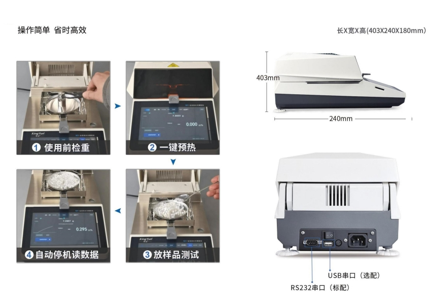 智能校準:內置校準模塊,無需手動放入砝碼,無需加入樣本一鍵預熱,自動校準周期設置(內校款)